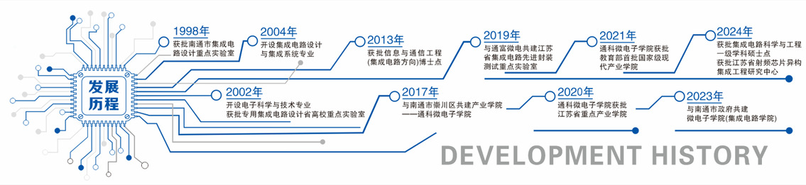 南通大学集成电路相关专业的发展可溯源至上世纪90年代,是国内较早开展集成电路教学科研的高等院校之一。1998年成立了南通市集成电路设计重点实验室;2002年,经教育部批准开设电子科学与技术专业,同年获批专用集成电路设计省高校重点实验室;2004年开设集成电路设计与集成系统专业;2013年,获批信息与通信工程一级学科博士点下设通信与信息系统集成电路二级学科博士点2017年与南通市崇川区合作共建产业学院——通科微电子学院;2019年与通富微电共建江苏省集成电路先进封装测试重点实验室;2020年通科微电子学院获批江苏省重点产业学院;2021年获批教育部首批现代产业学院;2024年重组获批半导体器件与集成电路设计封测省高校重点实验室,申报获批集成电路科学与工程一级学科硕士点、江苏省射频芯片异构集成工程研究中心。
