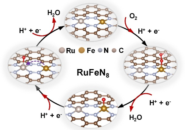 开发高效且稳定的非贵金属氧还原催化剂是降低质子交换膜燃料电池成本的关键,但传统的铁-氮-碳(Fe-N-C)催化剂面临着本征活性低与工况下易被活性氧物种氧化降解的双重挑战。该团队通过精准的协同电子调控策略,成功构建了钌-铁(Ru-Fe)双单原子催化剂,突破了上述瓶颈。该催化剂中的Ru位点与Fe-N4位点形成原子级邻近结构,不仅通过电子效应显著提升了Fe活性中心的本征活性,使其转换频率较传统催化剂提升1-2个数量级,更巧妙地利用Ru中心作为“电子中继站”高效清除有害自由基,从而同步实现了催化活性与稳定性的飞跃。优化后的催化剂在燃料电池中展现出0.840 V的半波电位与938 mW cm-2的峰值功率密度,并具备优异的耐久性。本研究为设计新一代高性能非贵金属催化剂开辟了新范式。